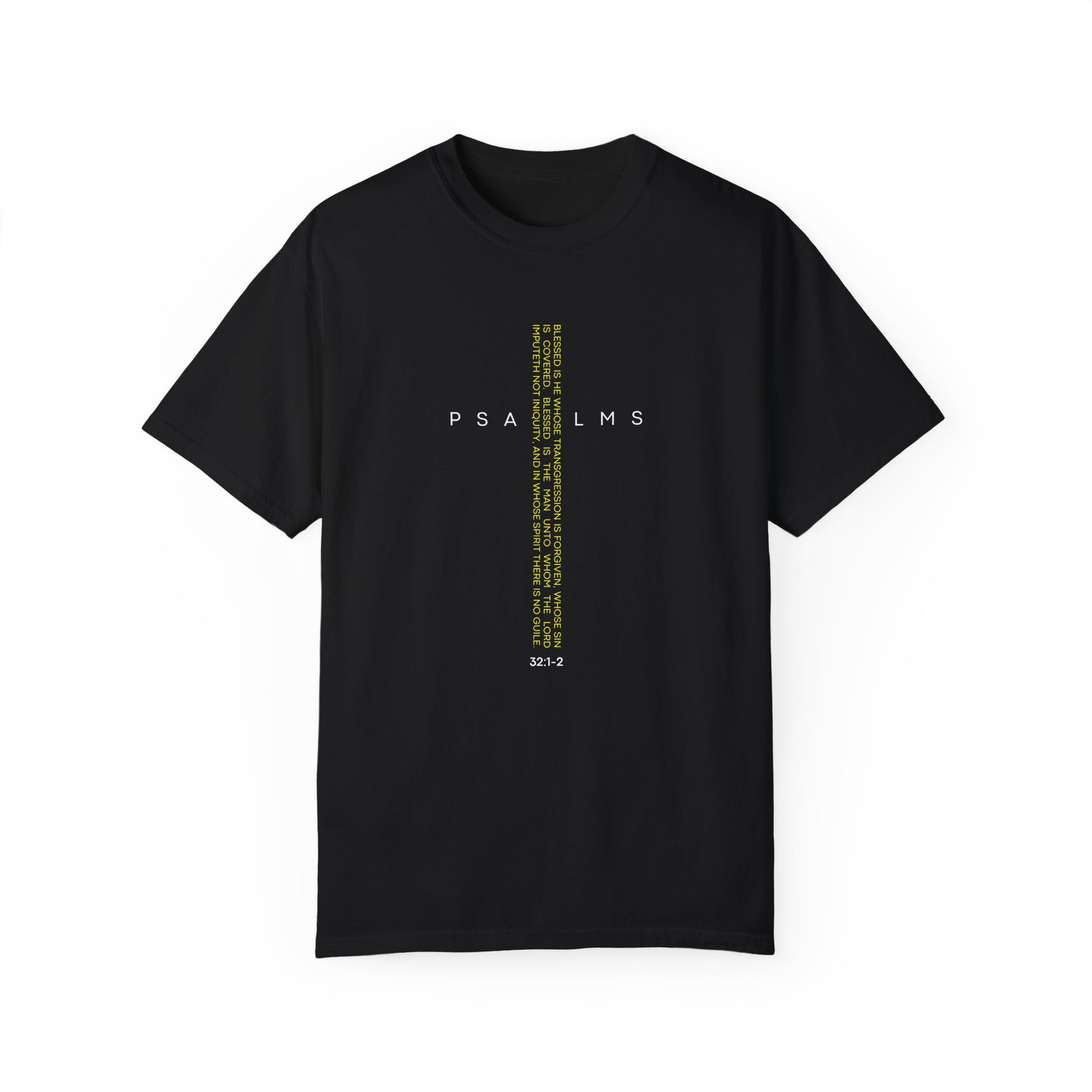 Celebrate your salvation with this Covered Psalm 32:1 "Cross" T-Shirt! Inspired by the scripture Psalm 32:1-2 (King James Version Bible), "Blessed is he whose transgression is forgiven, whose sin is covered. Blessed is the man unto whom the LORD imputeth not iniquity, and in whose spirit there is no guile". This T-shirt is soft, comfy, and made with good quality that lasts, wash after wash.